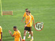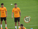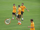 16.50 - Squadra in campo, si inizia il torello. Giocatori in cerchio con due giallorossi in mezzo, i primi ad iniziare sono Under e Petrungaro (attaccante della Primavera)