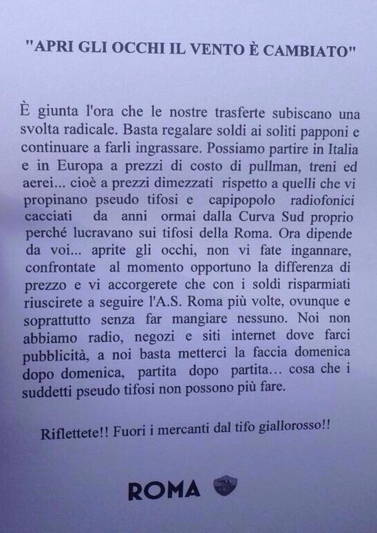 "E' giunta l'ora che le nostre trasferte subiscano una svolta radicale. Basta regalare soldi ai soliti papponi e continuare a farli ingrassare. Possiamo partire in Italia e in Europa a prezzi di costo di pullman, treni ed aerei... cioè a prezzi dimezzati rispetto a quelli che vi propinano pseudo tifosi e capipopolo radiofonici cacciati da anni ormai dalla Curva Sud proprio perchè lucravano sui tifosi della Roma. Ora dipende da voi... aprite gli occhi, non vi fate ingannare, confrontate al momento opportuno la differenza di prezzo e vi accorgerete che con i soldi risparmiati riuscirete a seguire l'A.S.Roma più volte, ovunque e soprattutto senza far mangiare nessuno. Noi non abbiamo radio, negozi e siti internet dove farci pubblicità, a noi basta metterci la faccia domenica dopo domenica, partita dopo partita... cosa che i suddetti pseudo tifosi non possono più fare. Riflettete!!! Fuori i mercanti dal tifo giallorosso!!".